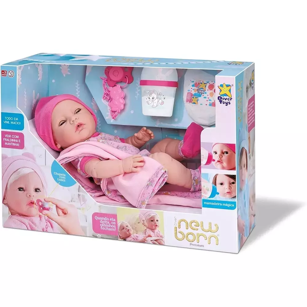 Boneca Diver New Born Premium sem Cabelo - 8159 - Divertoys - Dorémi Brinquedos Esse lançamento irá fazer você se apaixonar. Fabricado toda em vinil macio cheiroso e com vários acessórios. Deite sua New Born e ela fechará os olhinhos, sua mamadeira mágica é sensacional e a chupeta tem luzes. CARACTERÍSTICAS: - Material: Plástico - Marca: Diver Toys - Código do Fabricante: 8159 ESPECIFICAÇÕES: - Idade recomendada: A partir de 3 anos - Especificações cores e conteúdos podem variar de ilustrações. - Produto Certificado INMETRO. DIMENSÕES: - Dimensões aprox. do produto: 33 cm CONTEÚDO: 1 Boneca Diver New Born Premium sem Cabelo - 8159 - Divertoys (Produto Novo na caixa). Aviso Importante: Todas as informações divulgadas são de responsabilidade exclusiva do fabricante/fornecedor. As cores dos produtos podem variar entre as imagens mostradas acima ou fotos da embalagem. Imagens meramente ilustrativas.